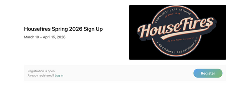 REGISTER for the location and time that works best for you. Every adult must be registered. Children are welcome to attend the LaFave's Housefires Group.
